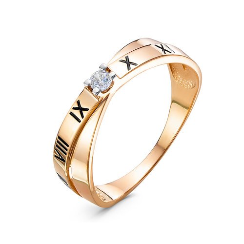 Оригинальное кольцо, украшенное римскими цифрамии и сверкающим фианитом, выполнено из красного золота 585 пробы