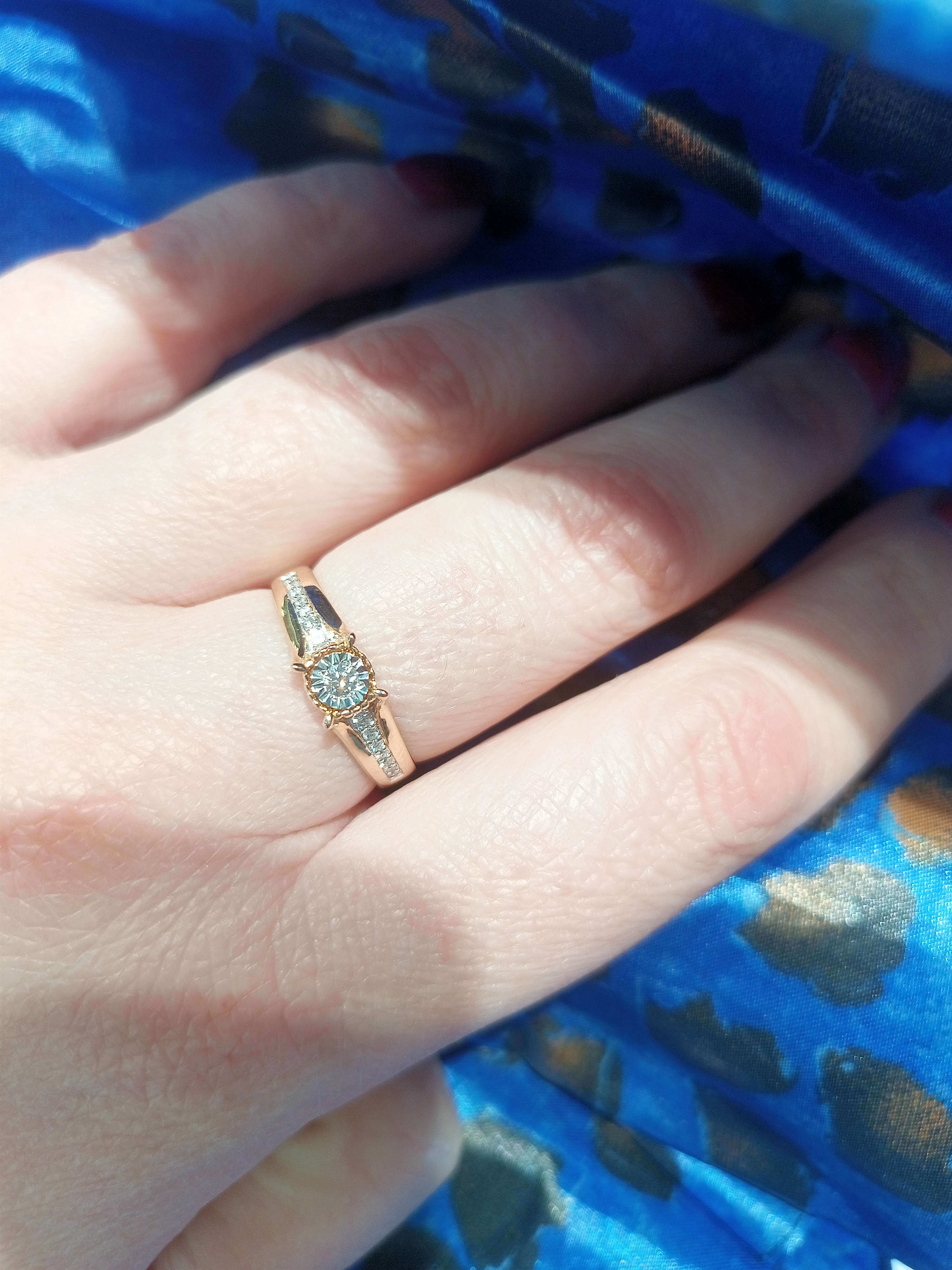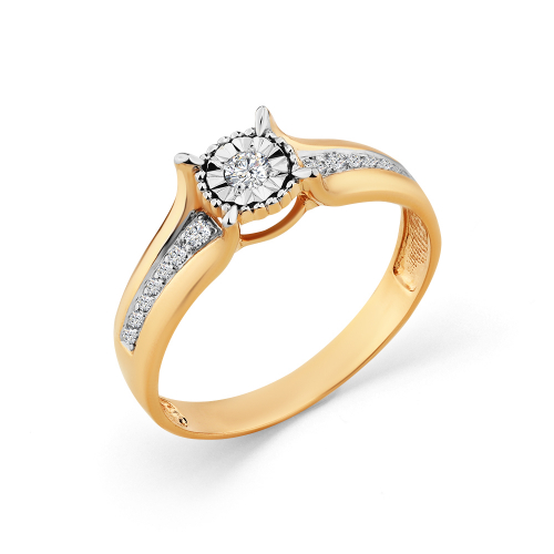 Это изящное и в то же время выразительное кольцо выполнено из комбинированного золота 585 пробы, в котором гармонично сочетаются два оттенка металла — тёплый красный и холодный белый. Такое цветовое решение придаёт украшению глубину, объём и благородный характер.В центре композиции — крупный бриллиант весом 0.062 карата, который сияет как главный акцент. Его обрамляют 14 бриллиантов меньшего диаметра, рассыпанных в изысканном рисунке по поверхности кольца. Такое распределение камней создаёт эффект мягкого светового ореола и придаёт кольцу утончённую динамику. Средняя характеристика камней: 1 Бр Круг 0,062; 10 Бр Круг 0,039; 2 Бр Круг 0,027; 2 Бр Круг 0,018