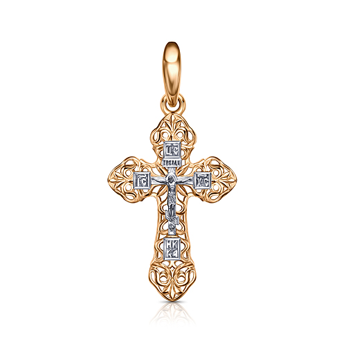 Этот элегантный крест выполнен из красного и белого золота 585 пробы, гармонично сочетающих в себе тёплые и холодные оттенки металла