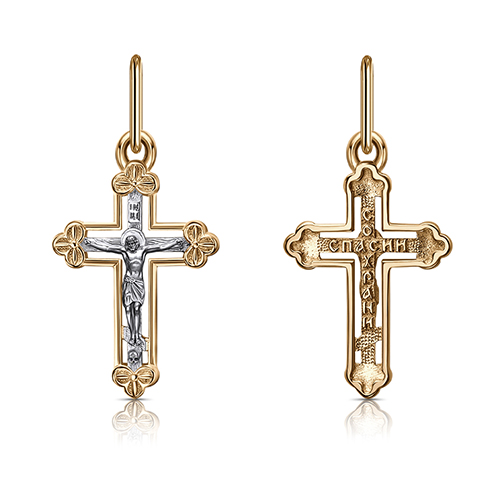 Компактный и изящный крест-подвеска выполнен из красного и белого золота 585 пробы — элегантное сочетание двух тонов придаёт украшению контрастный, выразительный облик