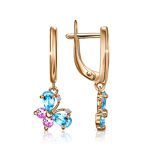 Эти элегантные серьги из красного золота 585 пробы — яркое воплощение современного ювелирного дизайна с романтичным акцентом. Их дизайн построен на контрасте форм и цветов: сверкающие фианиты "груша" насыщенного голубого оттенка гармонично сочетаются с нежно-розовыми круглыми камнями, а мелкие бесцветные фианиты добавляют игре света глубину и утончённость. Английский замок обеспечивает надёжную посадку и комфорт при повседневной носке, оставаясь при этом практически незаметным. Тёплый, выразительный блеск красного золота создаёт эффектный фон для сияющих камней, подчёркивая их оттенки и огранку.. Вставки: 4 Фианит груша 5.0*3.0 голуб, 4 Фианит круг 2.5 розовый, 4 Фианит круг 1.0 б/ц В комплект поставки входит: