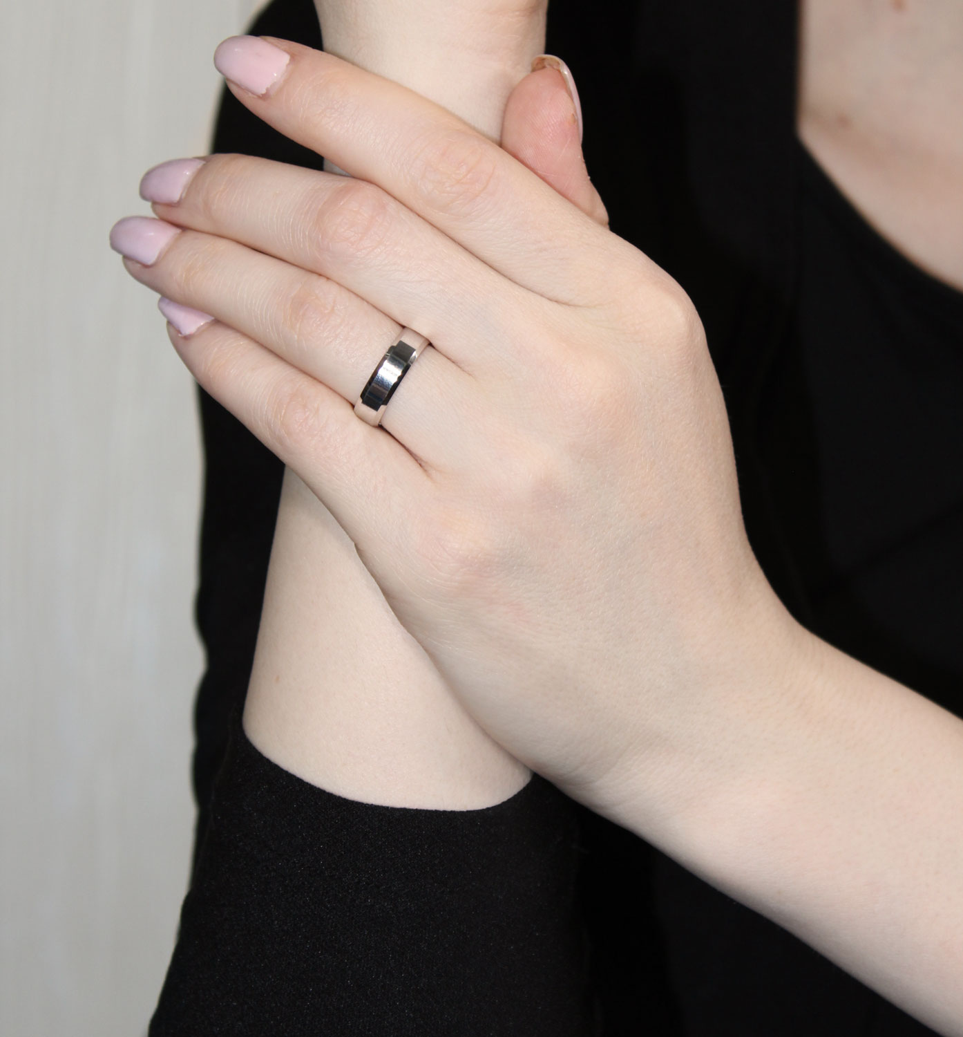 Полновесное обручальное кольцо с прямым профилем "шайба", выполнено из белого золота 585 пробы, особую оригинальность кольцу придают скошенные края в сочетании с идеально гладкой поверхностью кольца