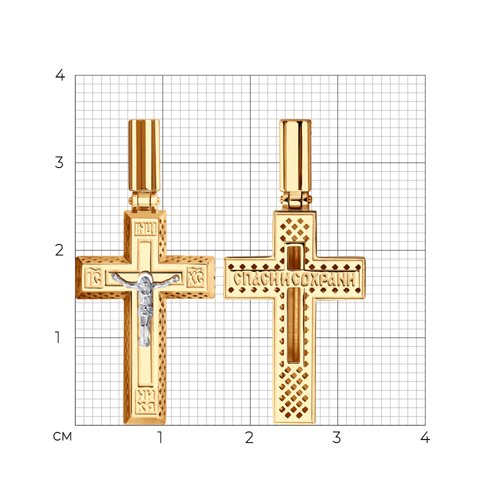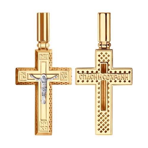 Крест, в котором исполнены все каноны Православной Церкви, выполнен в сочетании красного и белого золота 585 пробы.
