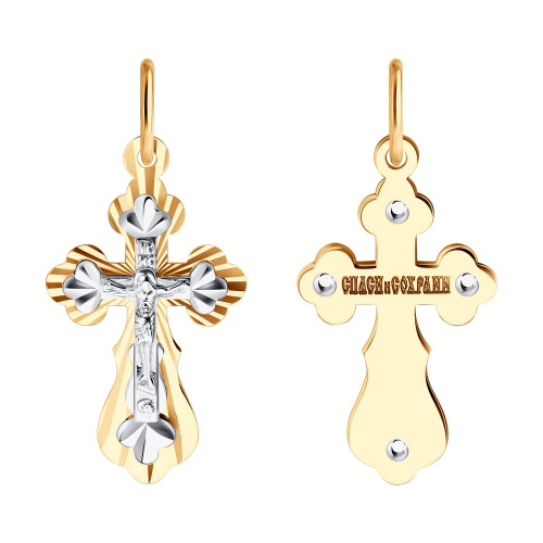 Подвеска в виде нательного креста выполнена из комбинированного золота 585 пробы. Крест соответствует всем канонам Православной церкви, на внешней стороне - распятие, на обороте надпись "Спаси и Сохрани". Украшение станет личным символом веры и подойдёт в качестве подарка верующему человеку. Изделие представлено брендом SOKOLOV. В комплект поставки входит: