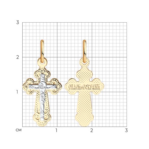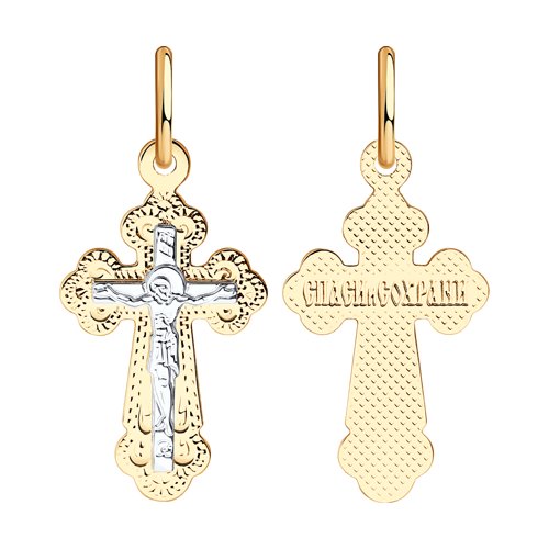 Подвеска - крест, в котором исполнены все каноны Православной Церкви, выполнен с сочетанием красного и белого золота 585 пробы, украшен гравировкой. Изделие представлено брендом SOKOLOV. В комплект поставки входит:
