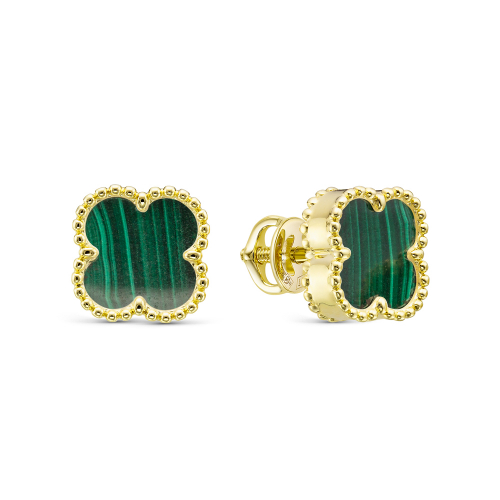 Стильные серьги в виде четырёхлистника со вставкой зеленого малахита выполнены из желтого золота 585 пробы
