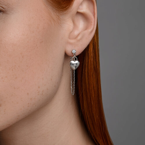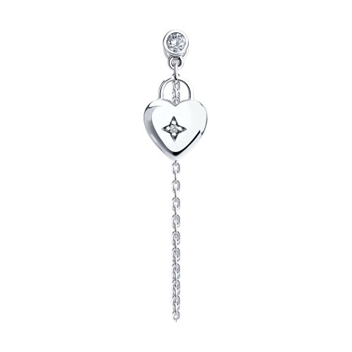Одиночная серебряная серьга выполнена из качественного серебра 925 пробы и обладает элегантным дизайном. Главное украшение — небольшой подвес в форме сердца, внутри которого находится сверкающий фианит. Сочетание гладкой металлической поверхности и тонкой огранки камня делает данную модель привлекательной и подходящей как для повседневного, так и для праздничного образа. Легкая и удобная в носке, эта серьга сможет украсить вашу внешность и подарить хорошее настроение. Представлено брендом SOKOLOV. Средняя характеритика камней: 2 × Фианит недраг В комплект поставки входит:
