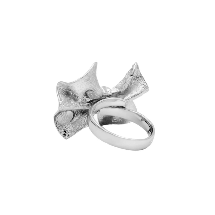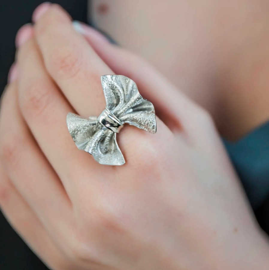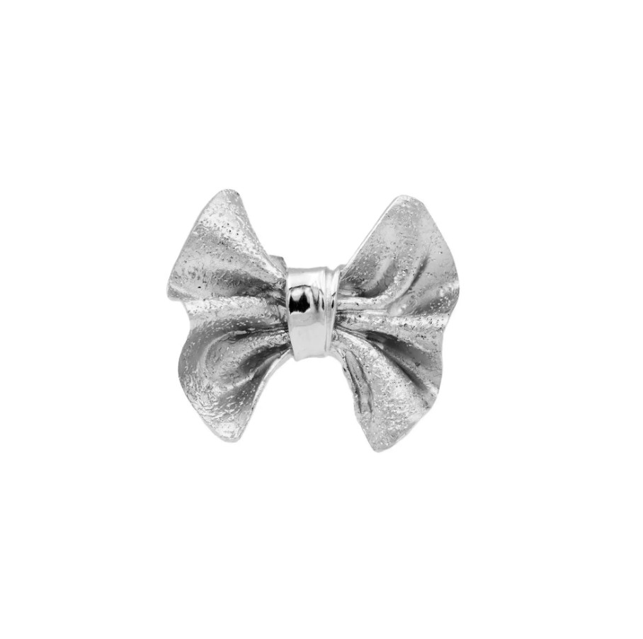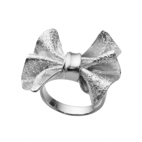 Очаровательное серебряное кольцо выполнено в форме бантика, воплощающего в себе дух игривости и нежности