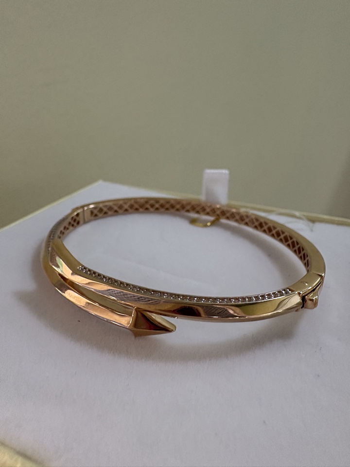 Стильный жесткий браслет в форме стрелы, выполненный из красного и белого золота 585 пробы и украшенный сверкающими фианитами, — это идеальное украшение для тех, кто любит быть в центре внимания