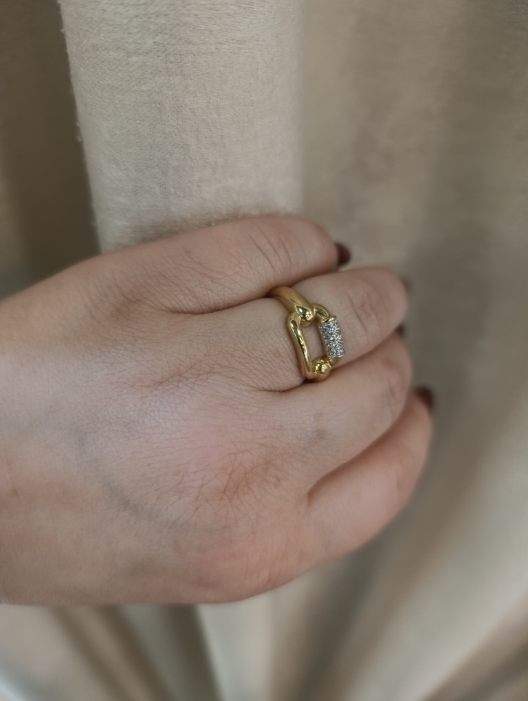 Кольцо, украшенное сверкающими фианитами, выполнено из жёлтого и белого золота 585 пробы