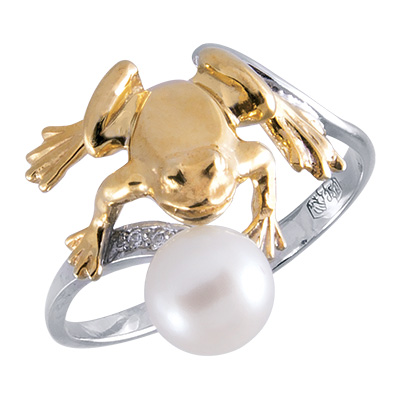 Оригинальное серебряное кольцо выполнено в форме царевны-лягушки и украшено натуральным жемчугом, что придает изделию особый шарм и привлекательность
