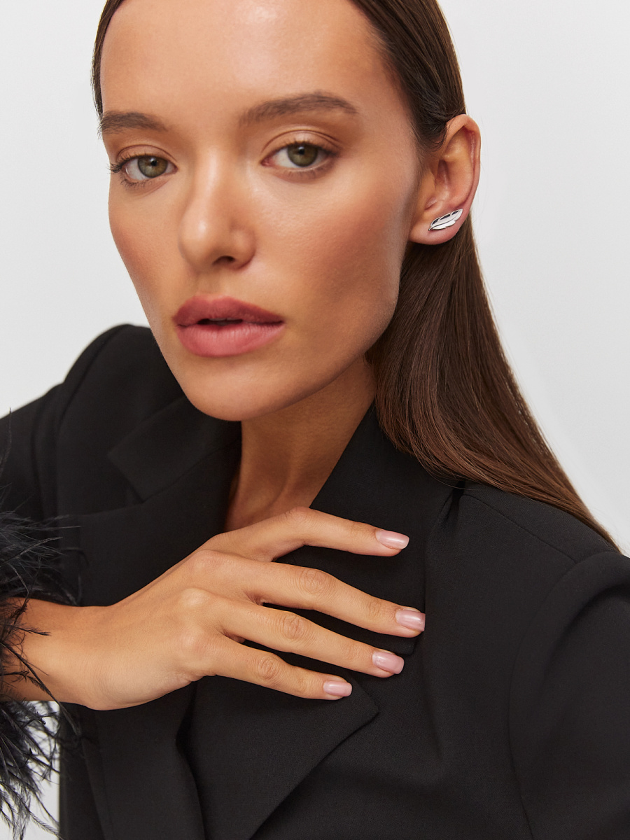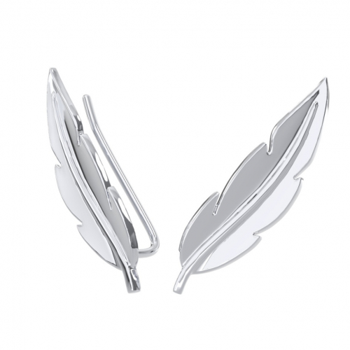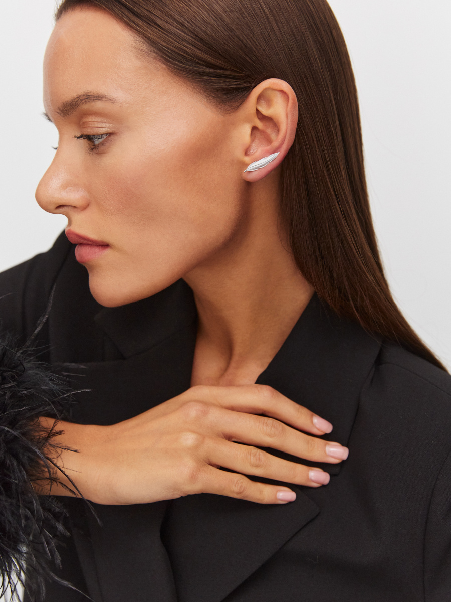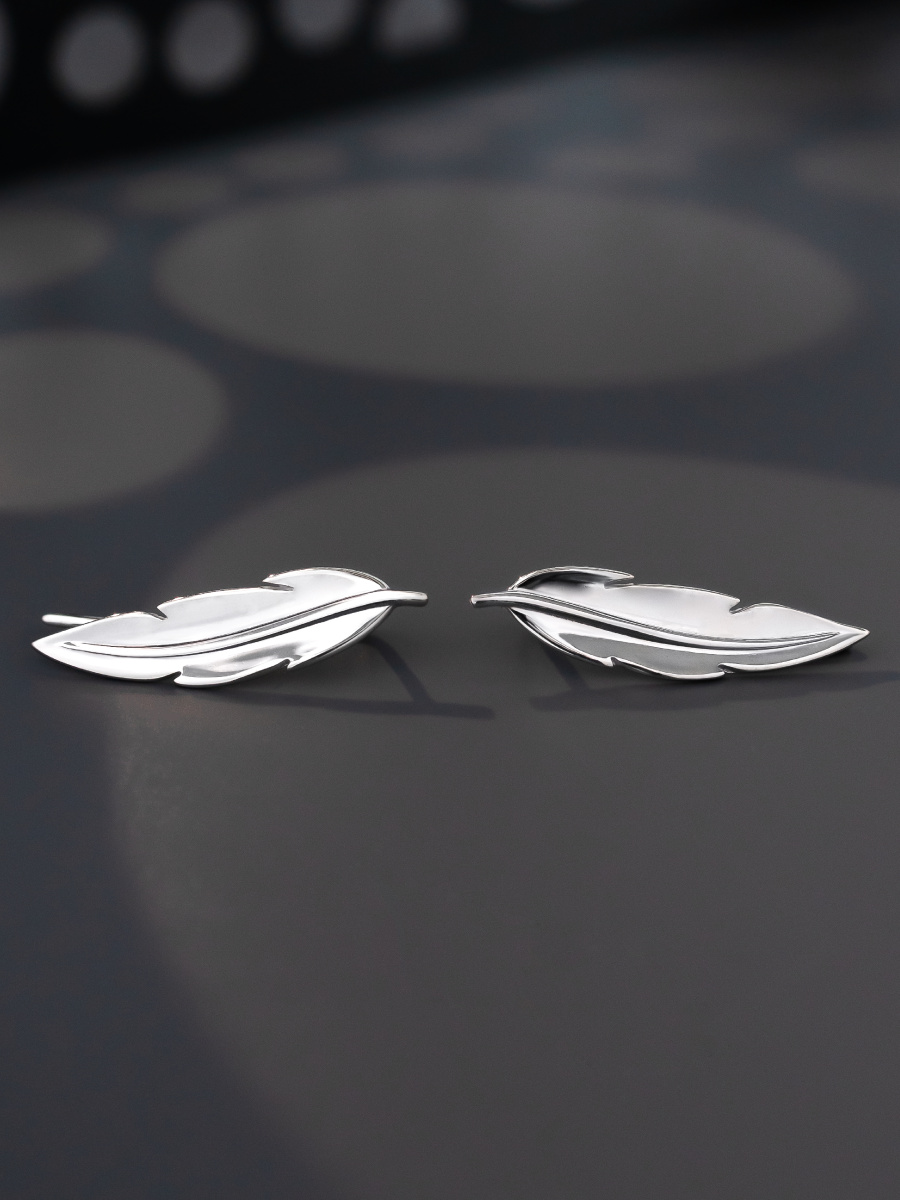 Стильные серебряные серьги выполнены в форме изящного пера и предусматривают стандартный прокол мочки уха