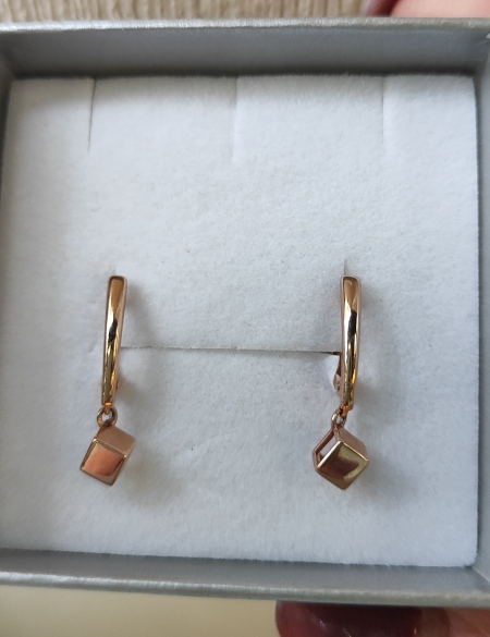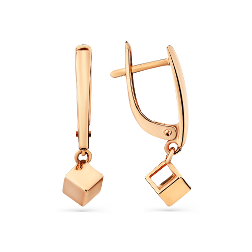 Удлинённые серьги с подвеской в виде изящного кубика, выполнены в красном золоте 585 пробы