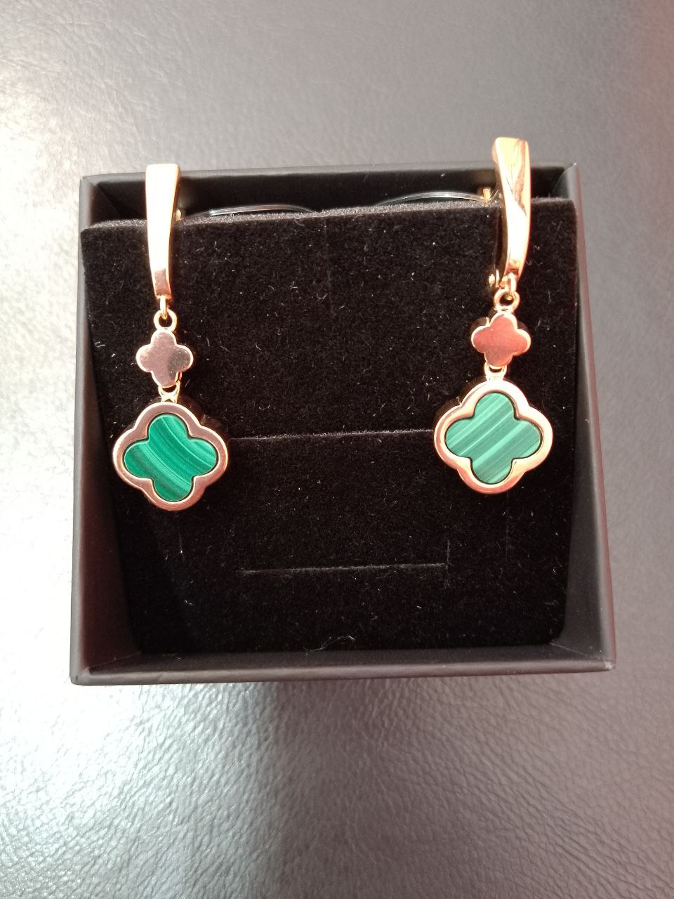 Стильные удлиненные серьги в виде четырёхлистника со вставкой зеленого малахита выполнены из красного золота 585 пробы