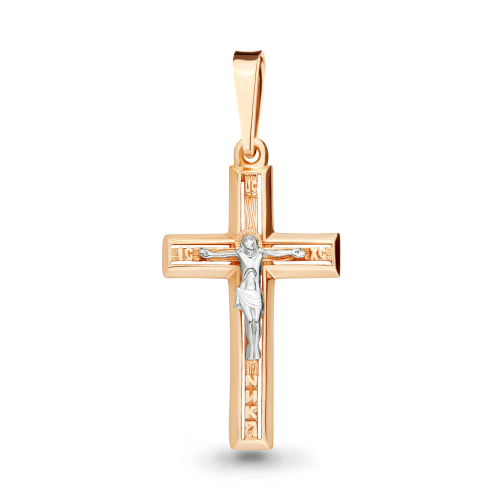 Крест выполнен в сочетании красного и белого золота 585 пробы, в нем исполнены все каноны Православной Церкви, на внешней стороне креста распятие, на обороте надпись "спаси и сохрани".