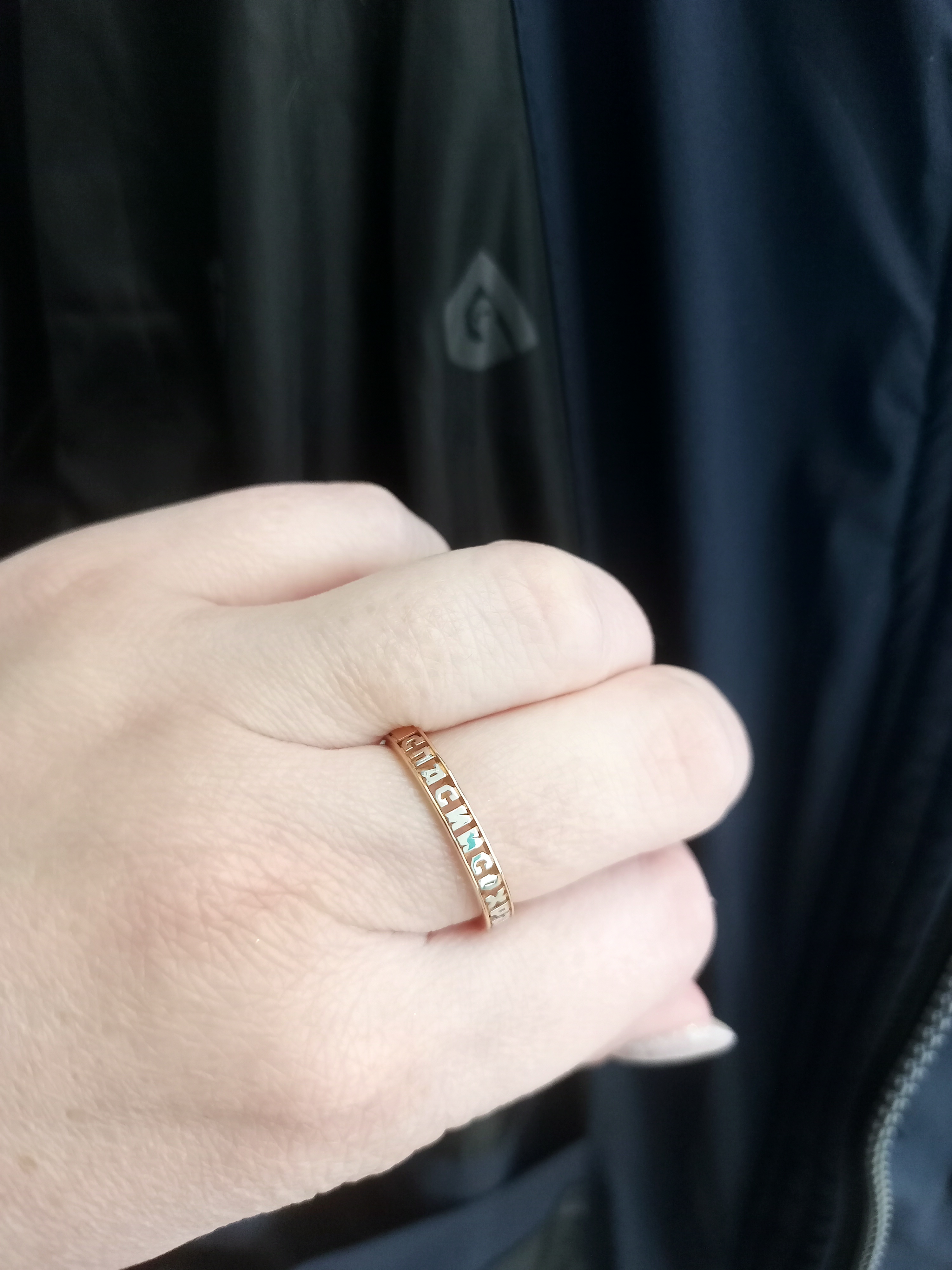 Оригинальное кольцо выполнено из красного и белого золота 585 пробы, на лицевой части нанесена надпись «Спаси и сохрани», распространённая в православных традициях