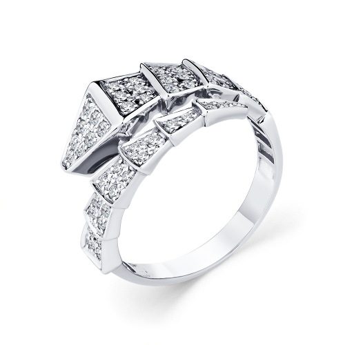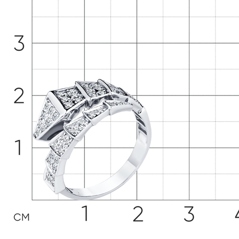 Кольцо с оригинальным дизайном из геометричных звеньев, украшенных россыпью бриллиантов, выполнено из белого золота 585 пробы