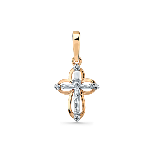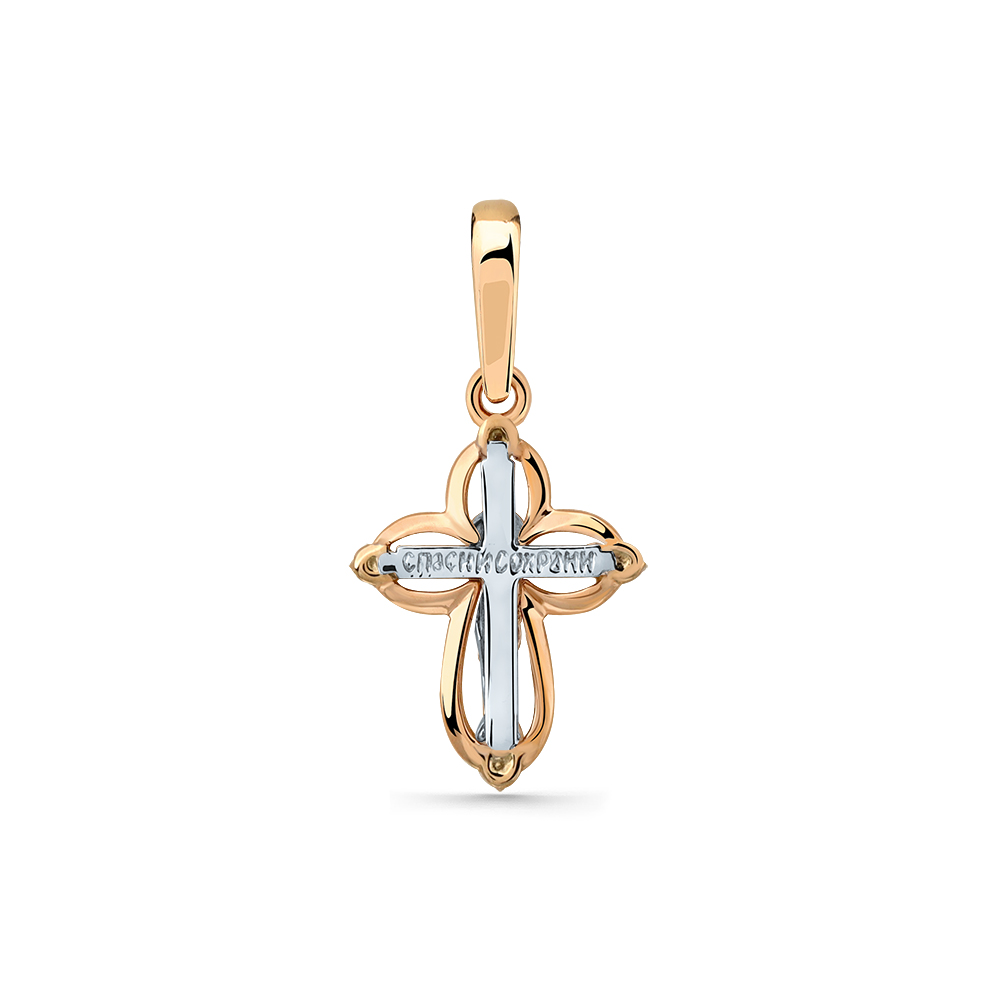 Изящный крест из комбинированного золота 585 пробы — это гармоничное сочетание тёплого и холодного оттенков драгоценного металла