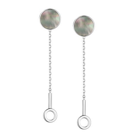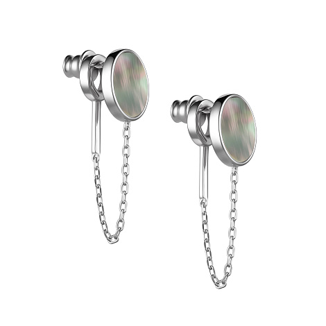 Серьги-пусеты с черным перламутром и подвесками-колечками выполнены из родированного серебра 925 пробы