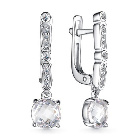 Стильные серьги в классическом дизайне, выполнены из серебра 925 пробы с родиевым покрытием, украшены яркими фианитами. Украшение покрыто металлом платиновой группы - родием, он защищает серебро от потемнения и придает искрящийся яркий блеск. Тип замка - английский, самый надежный и удобный. Изделие представлено брендом Алькор. Средняя характеристика камней: 2 Фианит Белый Бриолет круг 3,298