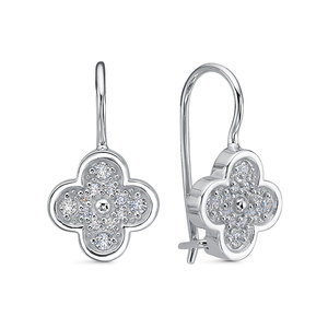 Детские серьги в виде цветка, украшенного сверкающими фианитами, выполнены из родированного серебра 925 пробы