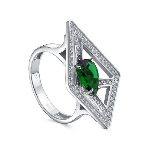 Стильное геометрическое кольцо выполнено из качественного серебра 925 пробы и украшено зеленым фианитом, окруженным сверкающими белыми фианитами