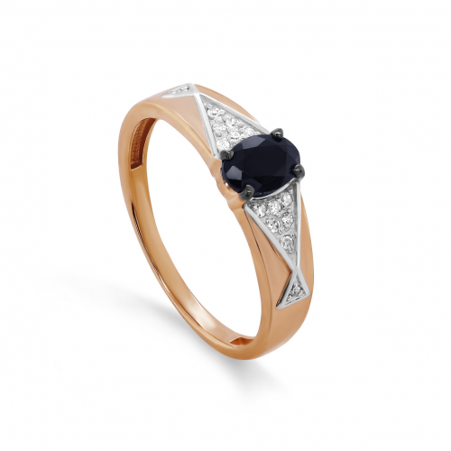 Кольцо из красного и белого золота 585 пробы, украшено роскошным сапфиром в окружении сверкающих бриллиантов. Черный сапфир — это драгоценный камень, имеющий плотный непрозрачный цвет и особый эффект астеризма. Изделие представлено брендом "KABAROVSKY". Средняя характеристика камней на артикул: 14 Бриллиант Круг-17 200-400 2/2А 0.051ct|1 Сапфир нат. черный Овал 6х4 0.673ct В комплект поставки входит: