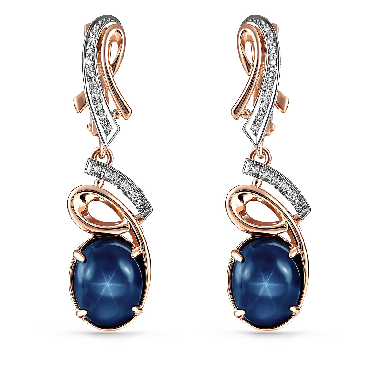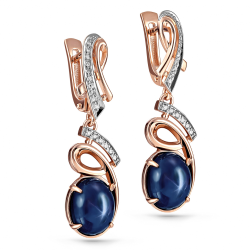 Роскошные серьги с подвесом, выполнены в сочетании красного и белого золота 585 пробы, украшены россыпью сияющих бриллиантов и сапфиров синего цвета. Тип замка - английский, самый надежный и удобный.
