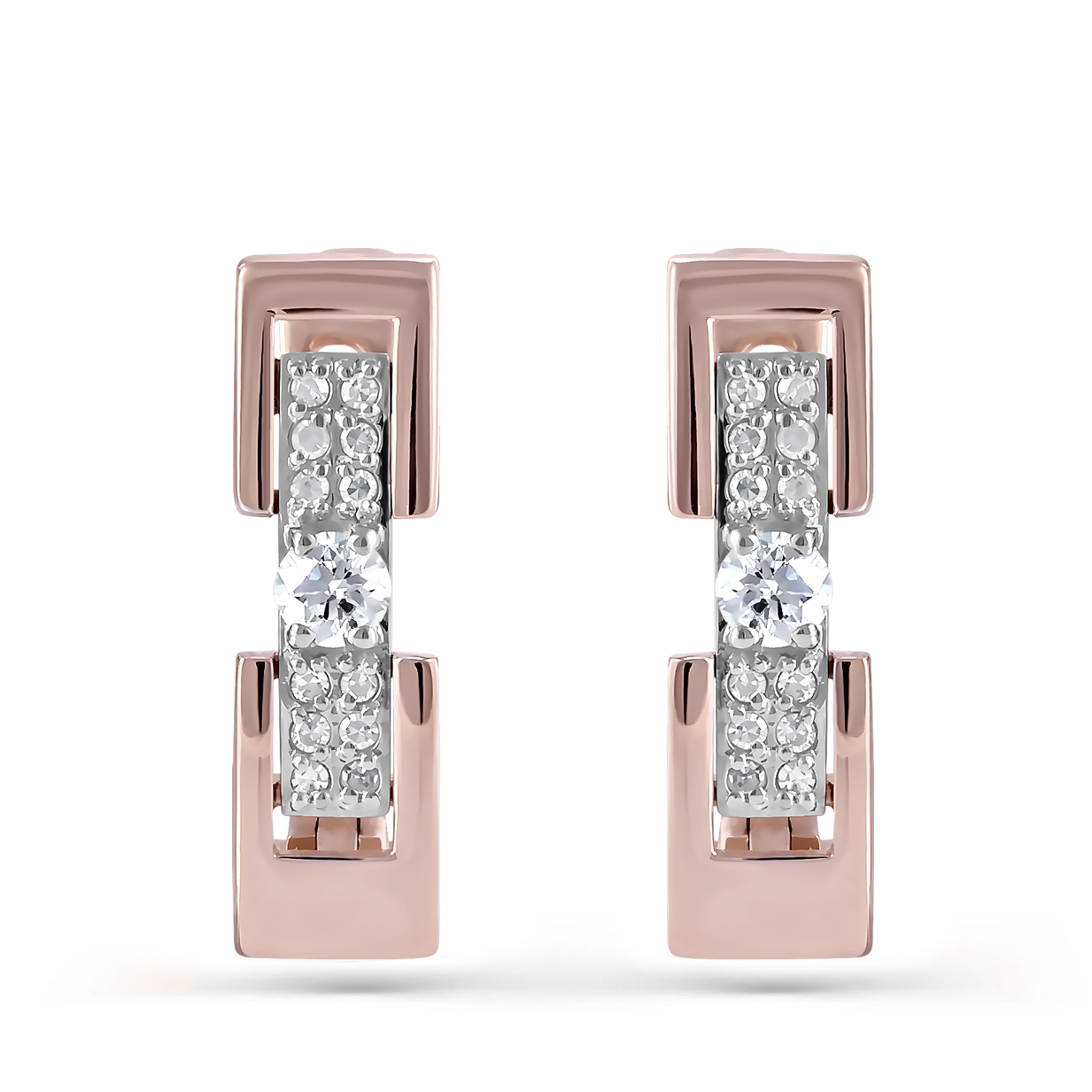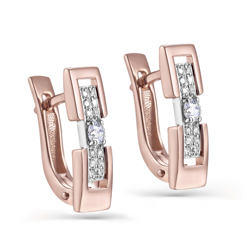 Стильные серьги, выполнены в сочетании красного и белого золота 585 пробы, украшены искрящейся россыпью бриллиантов