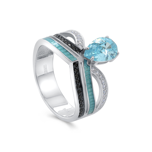 Серебряное кольцо с голубым фианитом в огранке «груша» и дополнительными дорожками белых и черных фианитов — это уникальное украшение, представляющее искусство ювелирного дела