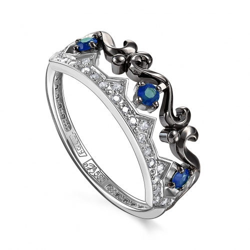 Серебряное кольцо 925 пробы с очаровательным сапфиром-корундом и множеством сверкающих фианитов поражает своим великолепием