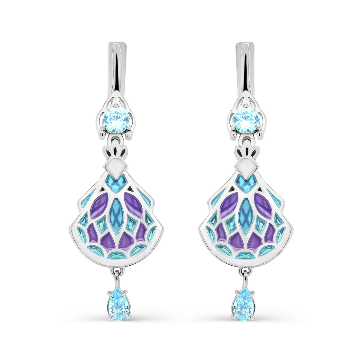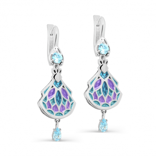 Яркие серебряные серьги из 925 пробы выполнены в оригинальном дизайне, сочетающем сверкающие голубые фианиты и смелый рисунок цветной эмали