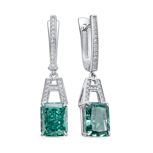 Изящные удлинённые серьги из серебряного сплава 925 пробы выделяются богатым сочетанием зеленых бриллианитов и сверкающих фианитов
