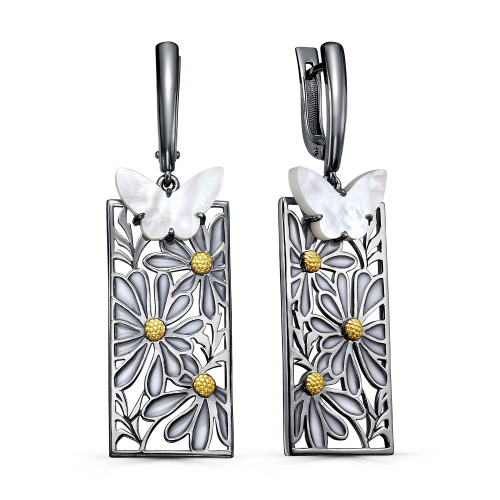 Элегантные удлинённые серебряные серьги из качественной 925 пробы, оснащённые натуральным перламутром и золотистой эмалью, придают особую привлекательность и оригинальность образу