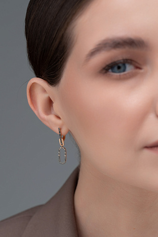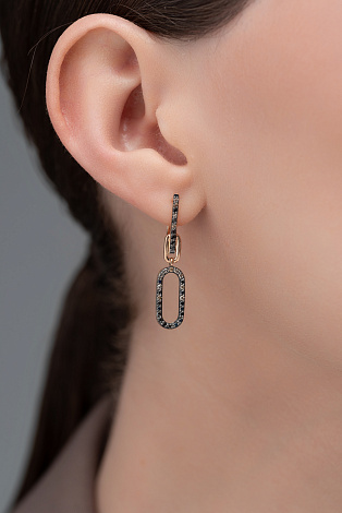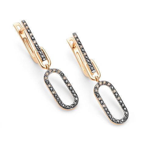 Изящные удлинённые серьги из красного золота 585 пробы украшены эффектной композицией из коньячных и черных бриллиантов