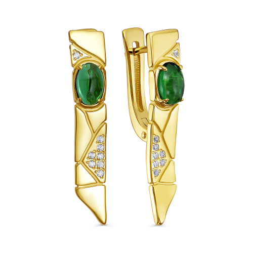 Изящные серебряные позолоченные серьги из 925 пробы созданы с использованием зеленого и белого фианитов, формируя интересный цветовой контраст. Зелёные фианиты выступают основным акцентом, символизируя природу и жизненную энергию, а белые — добавляют утонченную изюминку и сияние. Английские замки обеспечивают надежную фиксацию и удобную эксплуатацию. Этот стиль подойдёт женщинам, которые любят демонстрировать свой тонкий вкус и оригинальность выбора. Оптимальны как для повседневного использования, так и для важных событий. Представлено брендом KABAROVSKY. Средняя характеристика камней: 16 Фианит Круг 1,00|2 Фианит Овал кабошон 6,0х4,0 В комплект поставки входит: