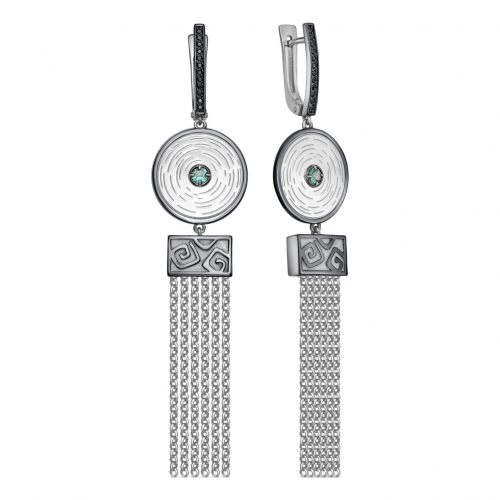 Элегантные удлинённые серьги из серебра 925 пробы выделяют зеленые изумруды и контрастирующие черные фианиты