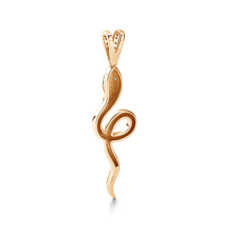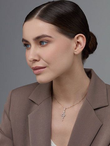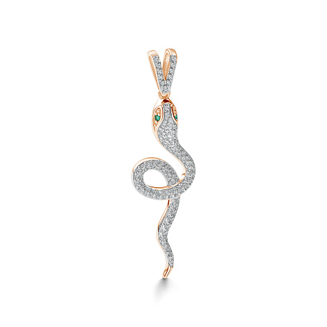 Оригинальная подвеска в виде змеи выполнена из красного и белого золота 585 пробы, украшена изысканными изумрудами и сверкающими бриллиантами