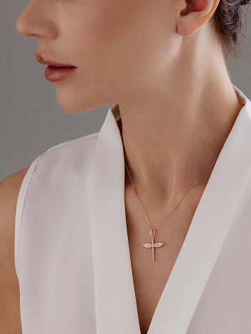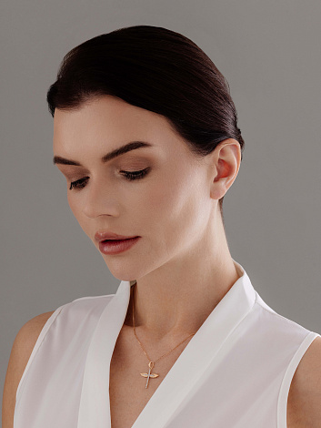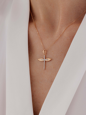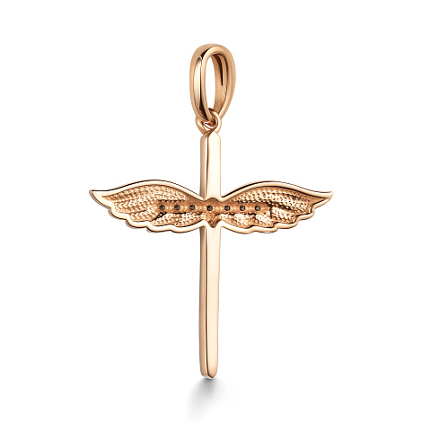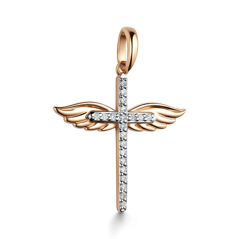 Декоративный крест изготовлен из красного и белого золота 585 пробы и украшен сверкающими бриллиантами