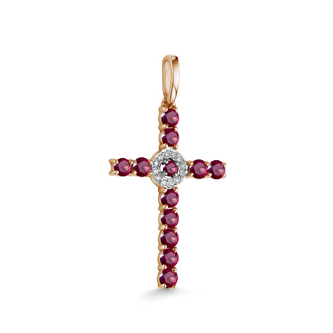 Изящная подвеска в форме креста выполнена из благородного красного и белого золота 585 пробы и украшена рубинами и бриллиантами