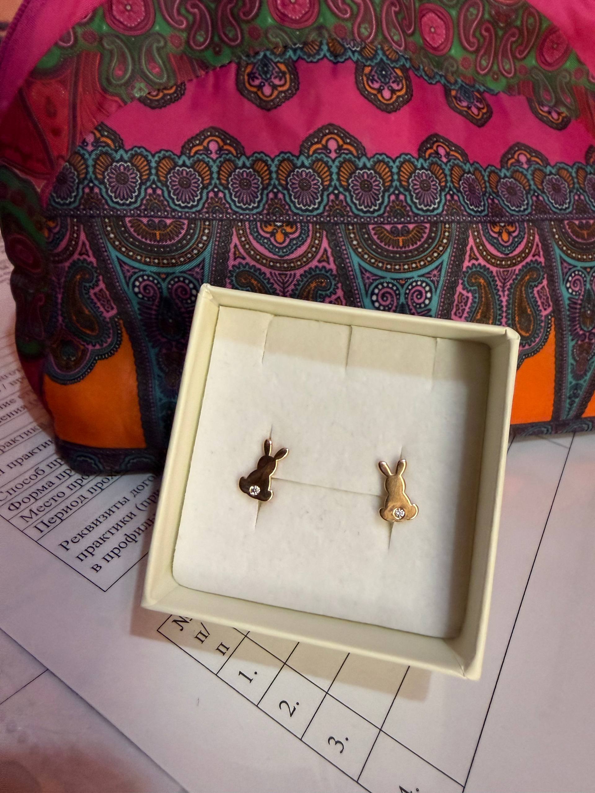Серьги в виде очаровательного зайки, выполнены из красного золота 585 пробы, со вставкой из фианитов от бренда Veronika