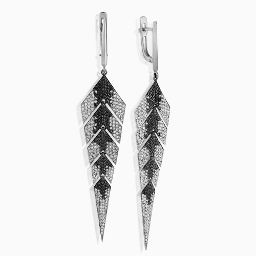 Удлинённые серьги выполнены из высококачественного белого золота 585 пробы и украшены роскошными чёрными и белыми бриллиантами