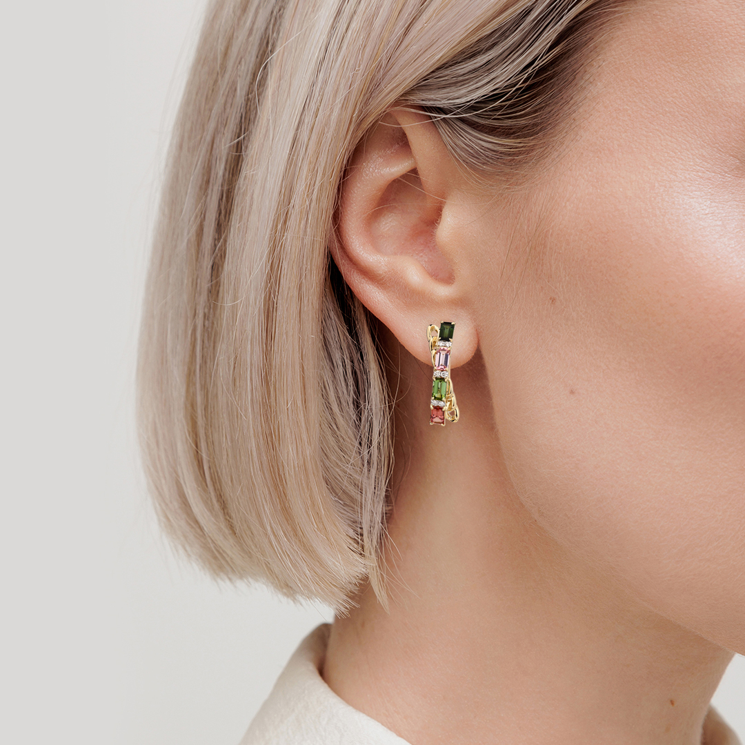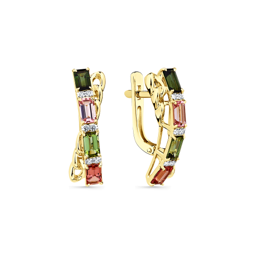 Элегантные серьги выполнены из желтого золота 585 пробы и украшены разноцветными турмалинами и сверкающими бриллиантами