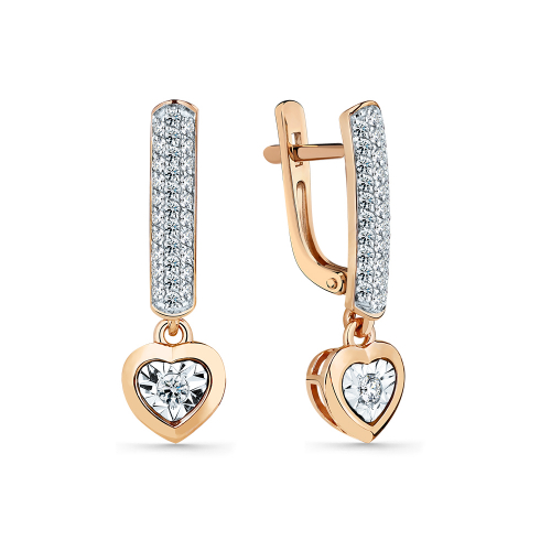Стильные серьги выполнены из красного и белого золота 585 пробы и украшены сверкающими бриллиантами