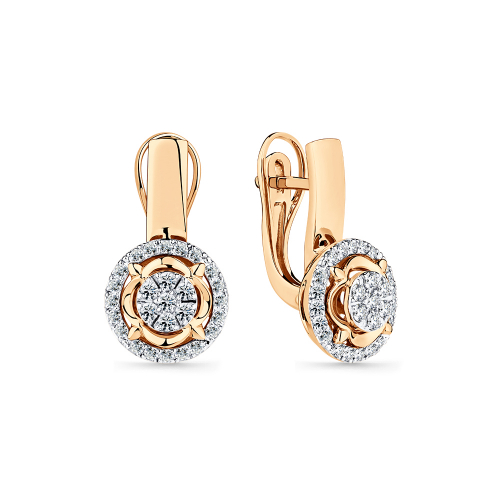 Стильные серьги выполнены из красного и белого золота 585 пробы и украшены сверкающими бриллиантами