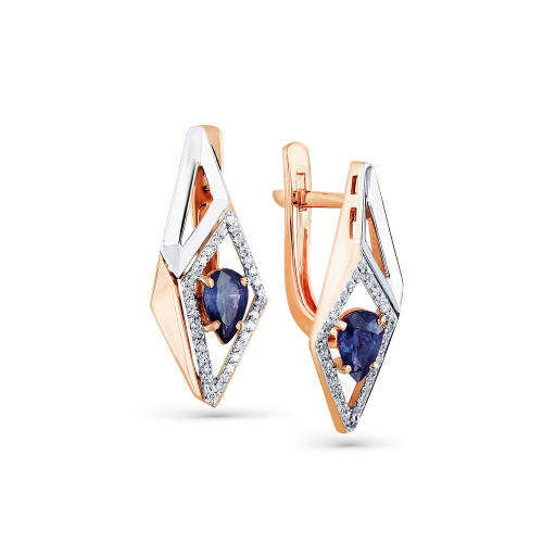 Стильные геометрические серьги выполнены из красного и белого золота 585 пробы и украшены сапфирами и сверкающими бриллиантами