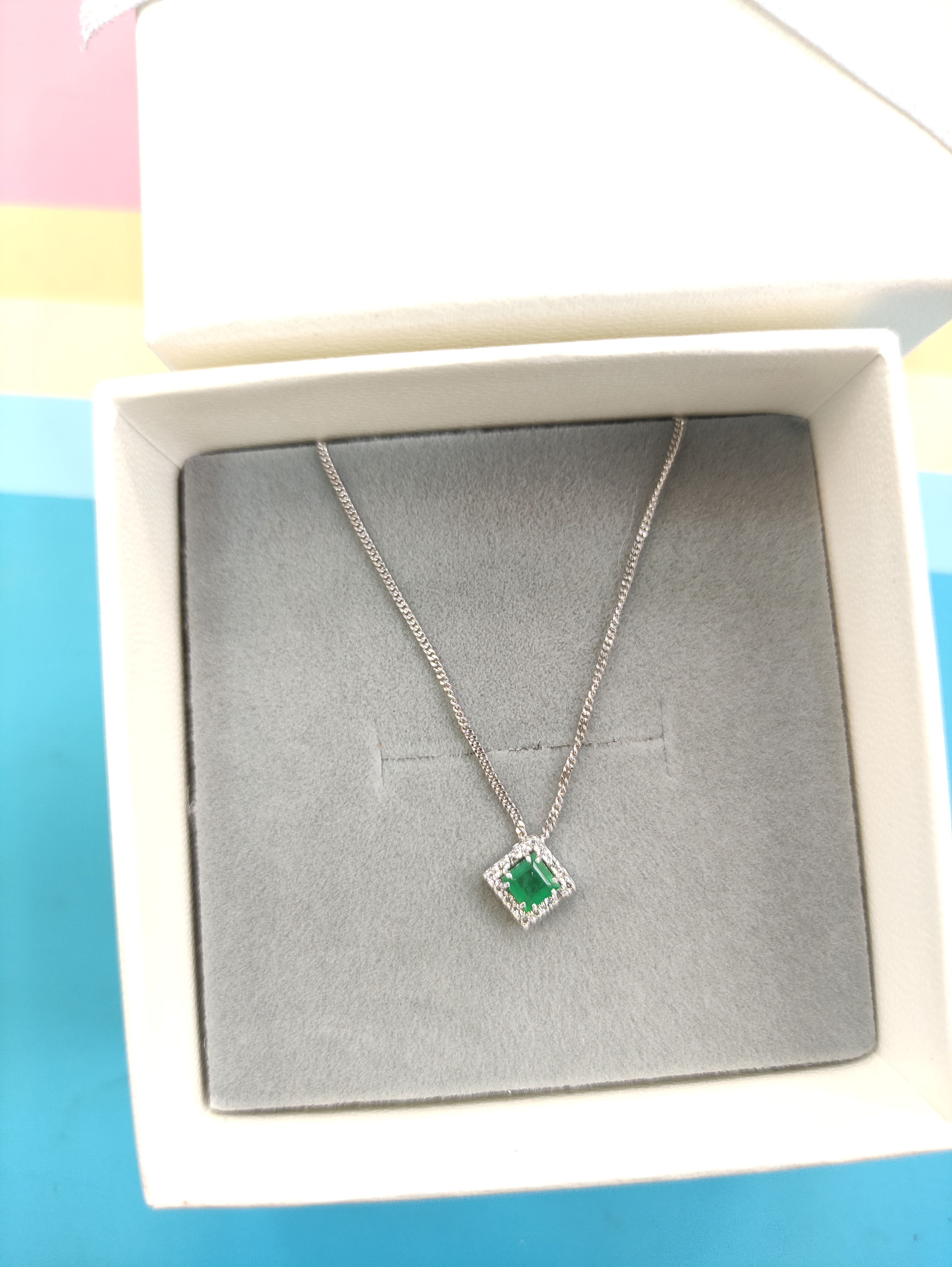 Изящное колье выполнено из белого золота 585 пробы и украшено геометрической подвеской с изумрудом и бриллиантами