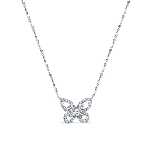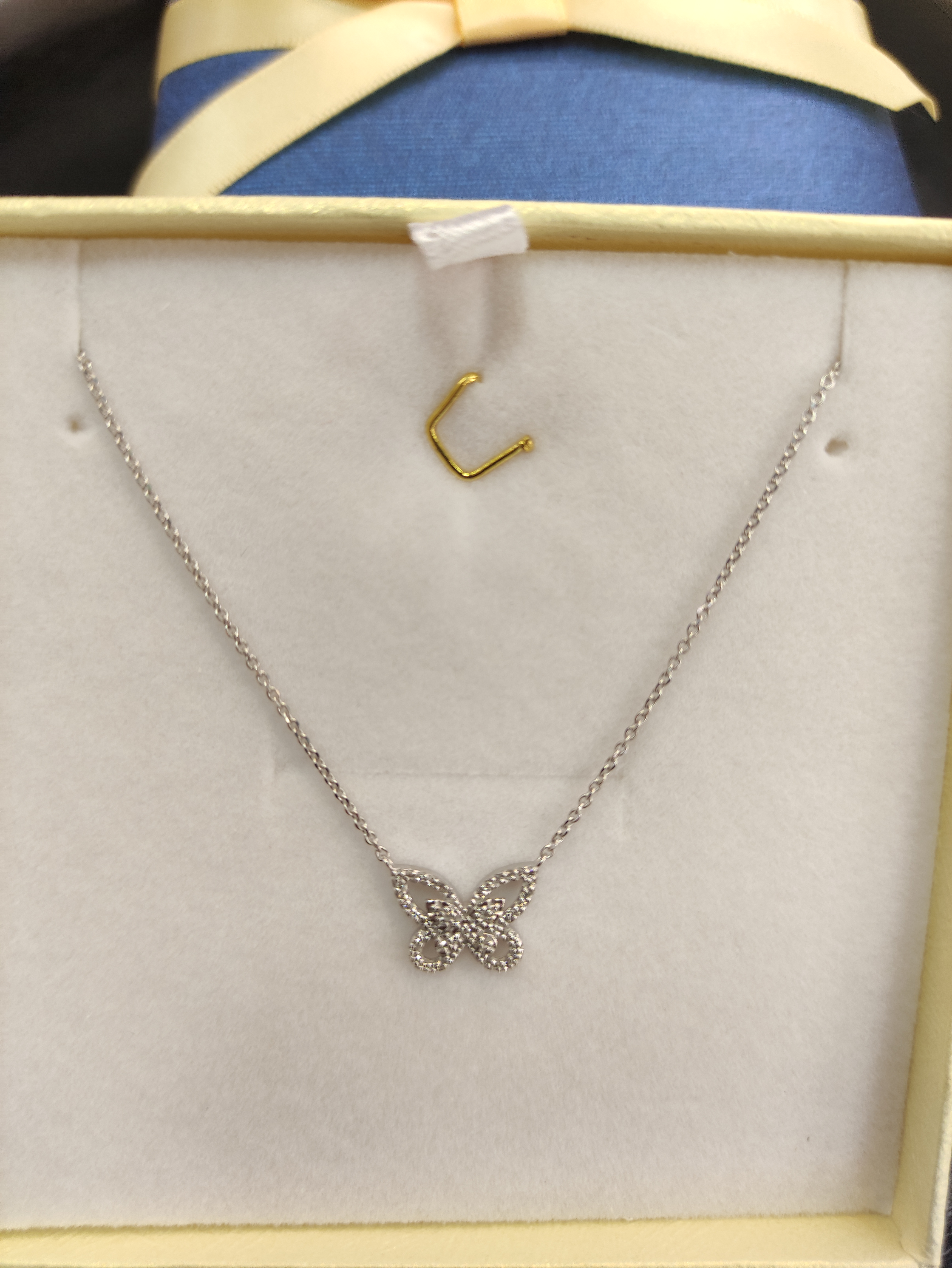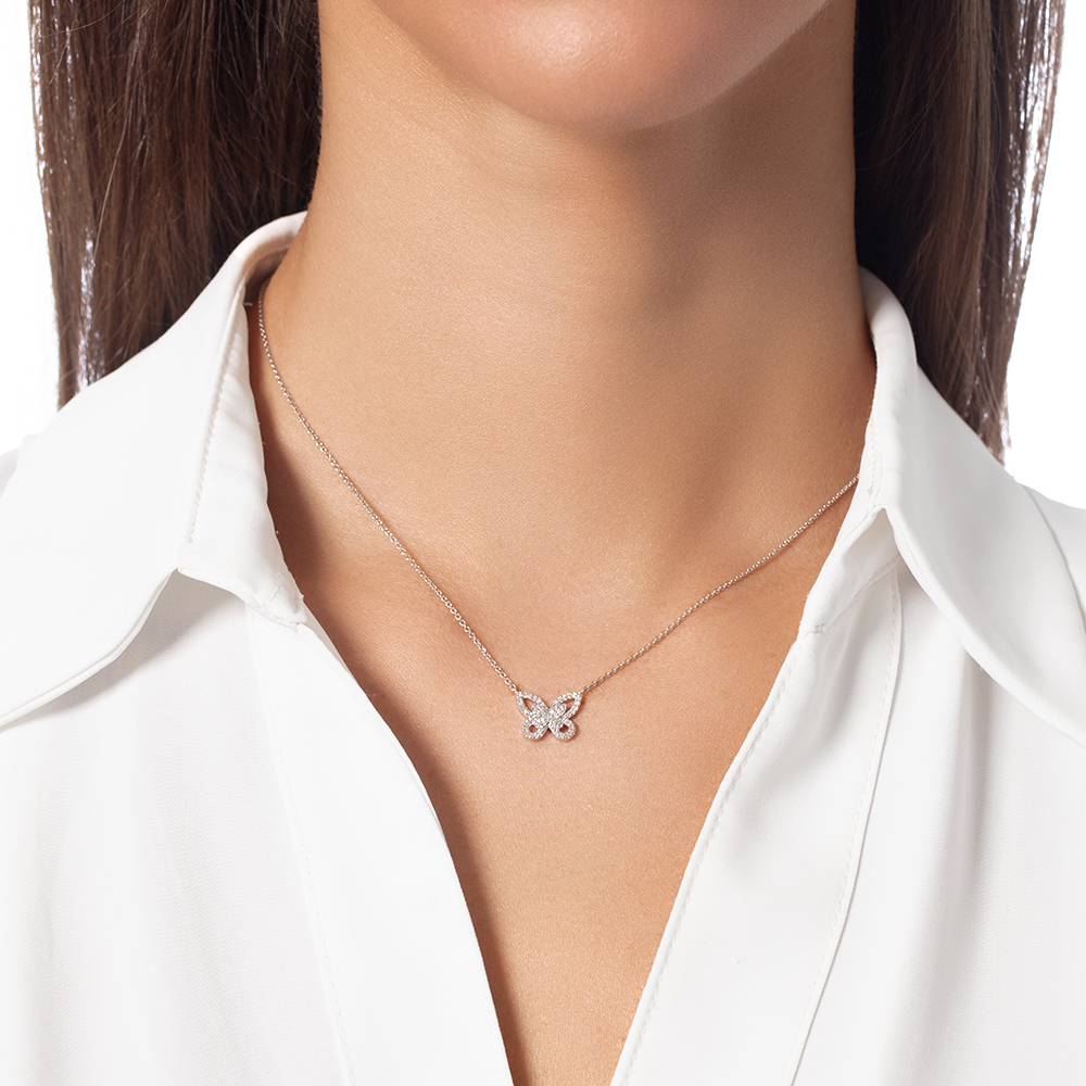 Элегантное колье выполнено из белого золота 585 пробы и украшено подвеской в форме бабочки, инкрустированной сверкающими бриллиантами