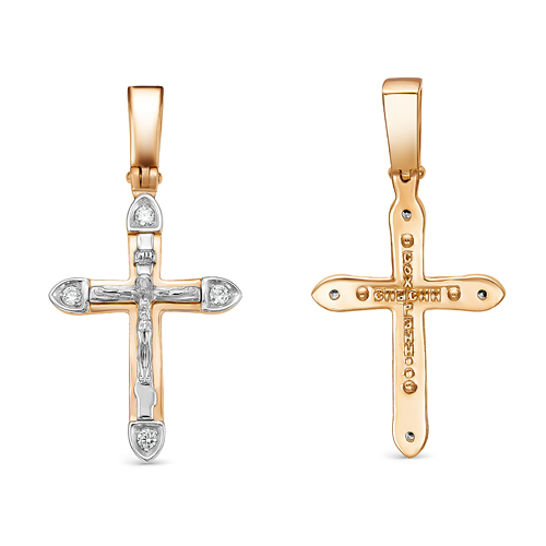 Православный крестик выполнен из красного и белого золота 585 пробы и украшен сверкающими бриллиантами