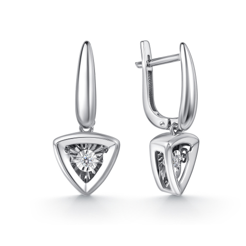 Удлинённые геометрические серьги выполнены из белого золота 585 пробы и украшены сверкающими бриллиантами
